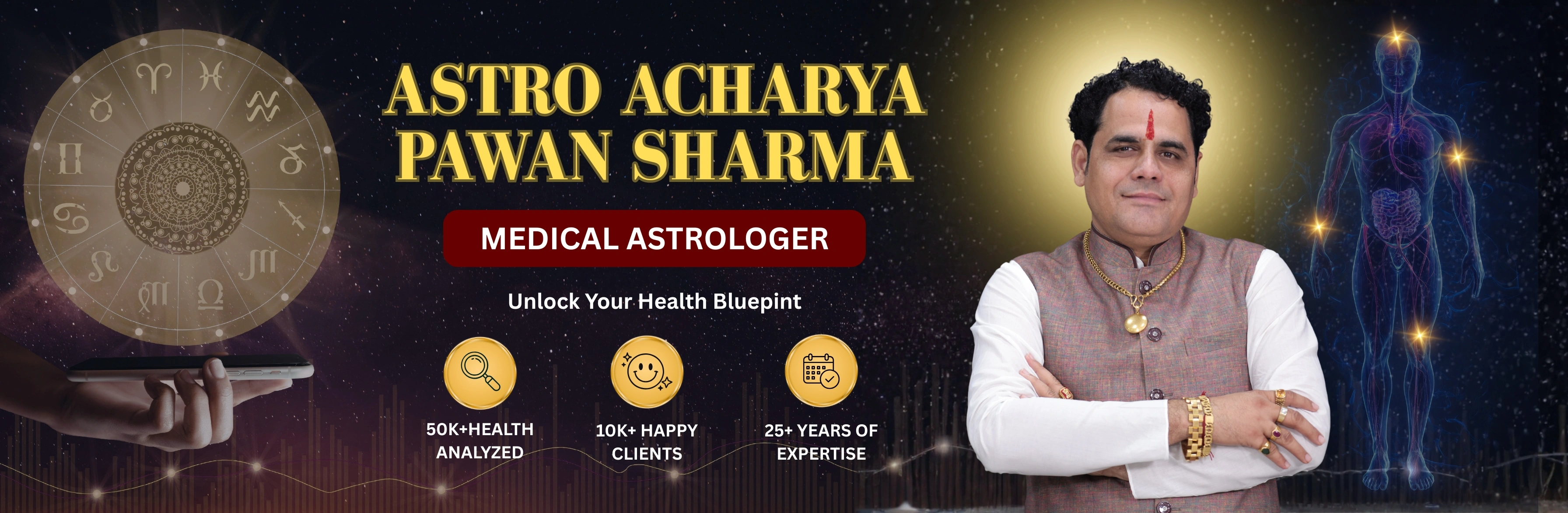 Medical Astrology for a Brighter Health Path — with Astro Acharya Pawan Medical Astrology—an important facet of Vedic Jyotish—is an ancient and highly specialized branch of astrology that examines the profound relationship between celestial bodies (the Sun, Moon, and planets) and human health, anatomy, and predisposition to disease. Its significance lies in its holistic and preventive approach, offering insights that are especially relevant in today’s world, which is marked by stress, chronic illnesses, and environmental imbalances. Rooted in the timeless macrocosm–microcosm principle, “As Above, So Below,” Medical Astrology is founded on the understanding that the same cosmic energies and rhythms shaping the universe are mirrored within the human body and individual constitution. More About Him Get Expert Guidance Medical Astrology Guidance for Holistic Well-Being Discover the Comprehensive Benefits of Our Medical Jyotish Consultations Personalized Health Insights Understand your unique constitution and potential health predispositions through detailed astrological analysis, allowing for proactive wellness planning. Life Cycle Awareness Gain awareness of favorable periods for health initiatives, lifestyle changes, and preventive measures by understanding the natural cycles in uencing your life. Holistic Well-Being Align your physical, mental, and emotional health with cosmic rhythms, fostering a harmonious and balanced lifestyle. Informed Decision-Making Make empowered choices regarding health and personal growth by integrating astrological insights into your daily life. Who Can Benefit from Medical Astrology Consultations? Individuals Seeking Preventive Care: Identify potential health challenges early and take proactive steps to maintain optimal well-being. Those Facing Health Uncertainties: Gain clarity on unexplained health issues and explore alternative perspectives for healing. Personal Development Enthusiasts: Understand personal strengths and challenges to support overall growth and self-awareness. Individuals at Life Crossroads: Receive guidance during signi cant life transitions to align decisions with cosmic in uences. Stress-Affected Individuals: Learn effective strategies to manage stress and achieve emotional balance through astrological insights. Wellness Seekers: Enhance your holistic health journey by integrating ancient wisdom with modern practices. Preventive Care Health Clarity Personal Development Life Transitions Stress Management Holistic Wellness Preparing for Your Medical Astrology Consultation? Discover health insights through your birth chart—identify potential imbalances, stress periods, and supportive remedies to enhance overall well-being. 🌿✨ What to Bring Accurate Birth Details: Share your exact date, time, and place of birth to enable precise astrological analysis. > Personal Questions: Prepare specific health or life-related questions you wish to explore during the consultation. During Your Session Chart Analysis: Engage in an in-depth discussion covering your health history, lifestyle, diet, and current concerns. Personalized Recommendations: Receive tailored advice on dietary adjustments, herbal supplements, and lifestyle modi cations to promote balance and well-being. After Your Consultation Implement Insights: Apply the personalized guidance to your daily routine to harmonize with natural cycles and enhance well-being. Follow-Up: Consider scheduling periodic consultations to adjust recommendations based on evolving planetary influences.